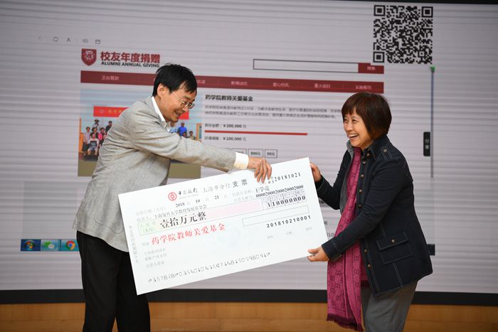 色情片 2018年校友返校日活动,色情片 常务副院长潘俊向校友们介绍了学院近年来接受捐赠的情况,她感谢校友们对学院事业发展给予的关心和支持,并且向校友们推出了“色情片 教师关爱基金”筹款项目,81级药学专业校友王学亮率先以个人名义捐赠10万元支持该项目。